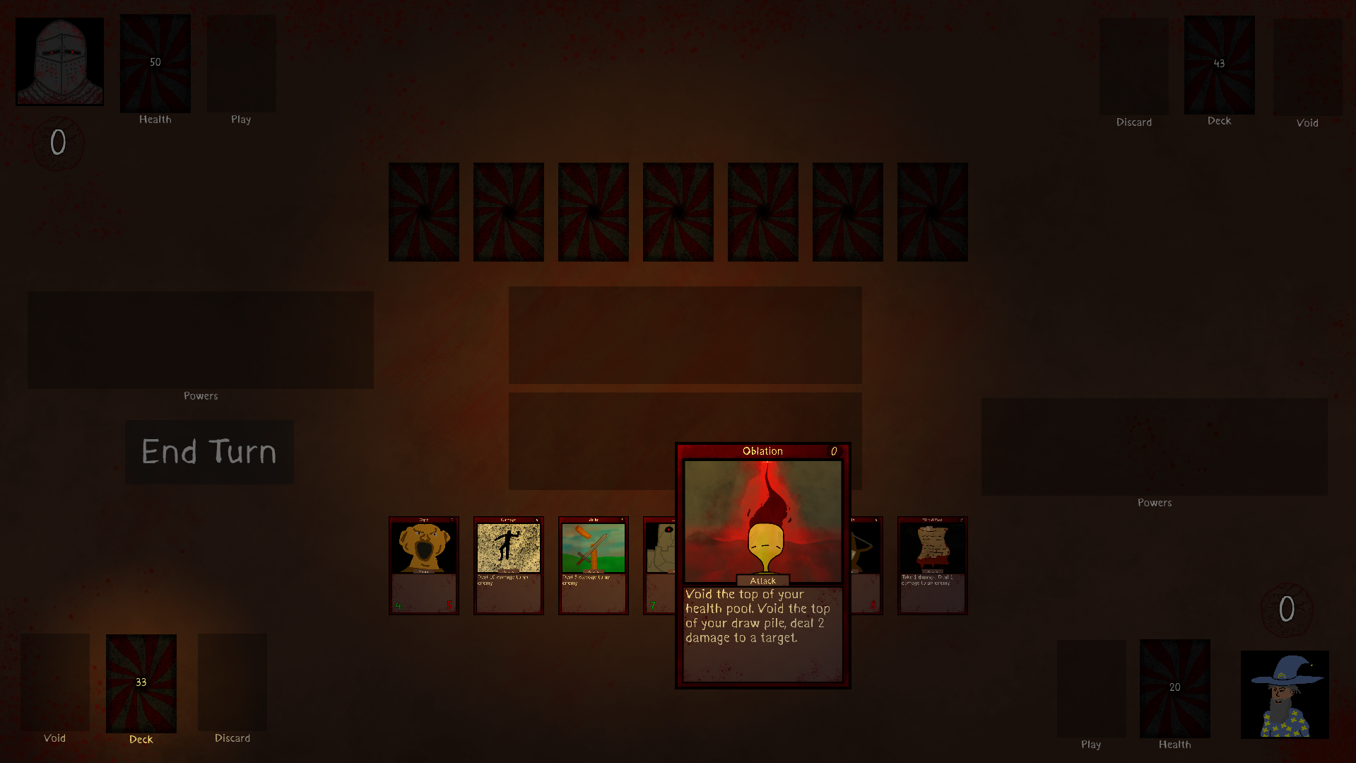 - Cards require energy to play. Place card from your hand into your discard to gain energy.